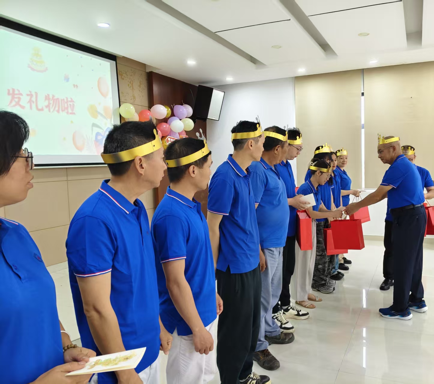 ?緊接著,大屏幕上播放了來(lái)自各部門(mén)領(lǐng)導(dǎo)和同事提前錄制的生日祝福視頻。一聲聲“生日快樂(lè)”,一句句暖心叮嚀,跨越空間的距離,匯聚成愛(ài)的河流,流淌進(jìn)每一位壽星的心田。? ? ? ? 在祝福聲中本季度的壽星們佩戴上可愛(ài)的生日帽,笑容滿(mǎn)面地走上舞臺(tái)。承載著公司滿(mǎn)滿(mǎn)心意與祝福的精美禮物和賀卡早已準(zhǔn)備就緒。李總親切地將禮物一一送到壽星們手中,并輕聲送上專(zhuān)屬的祝福話語(yǔ)。每一份禮物,每一句祝福,都凝結(jié)著公司對(duì)員工的重視與關(guān)愛(ài)。壽星們接過(guò)禮物時(shí),臉上洋溢的感動(dòng)與喜悅,成為現(xiàn)場(chǎng)最動(dòng)人的風(fēng)景,這溫情脈脈的瞬間,在鏡頭下定格,成為永恒的美好記憶。